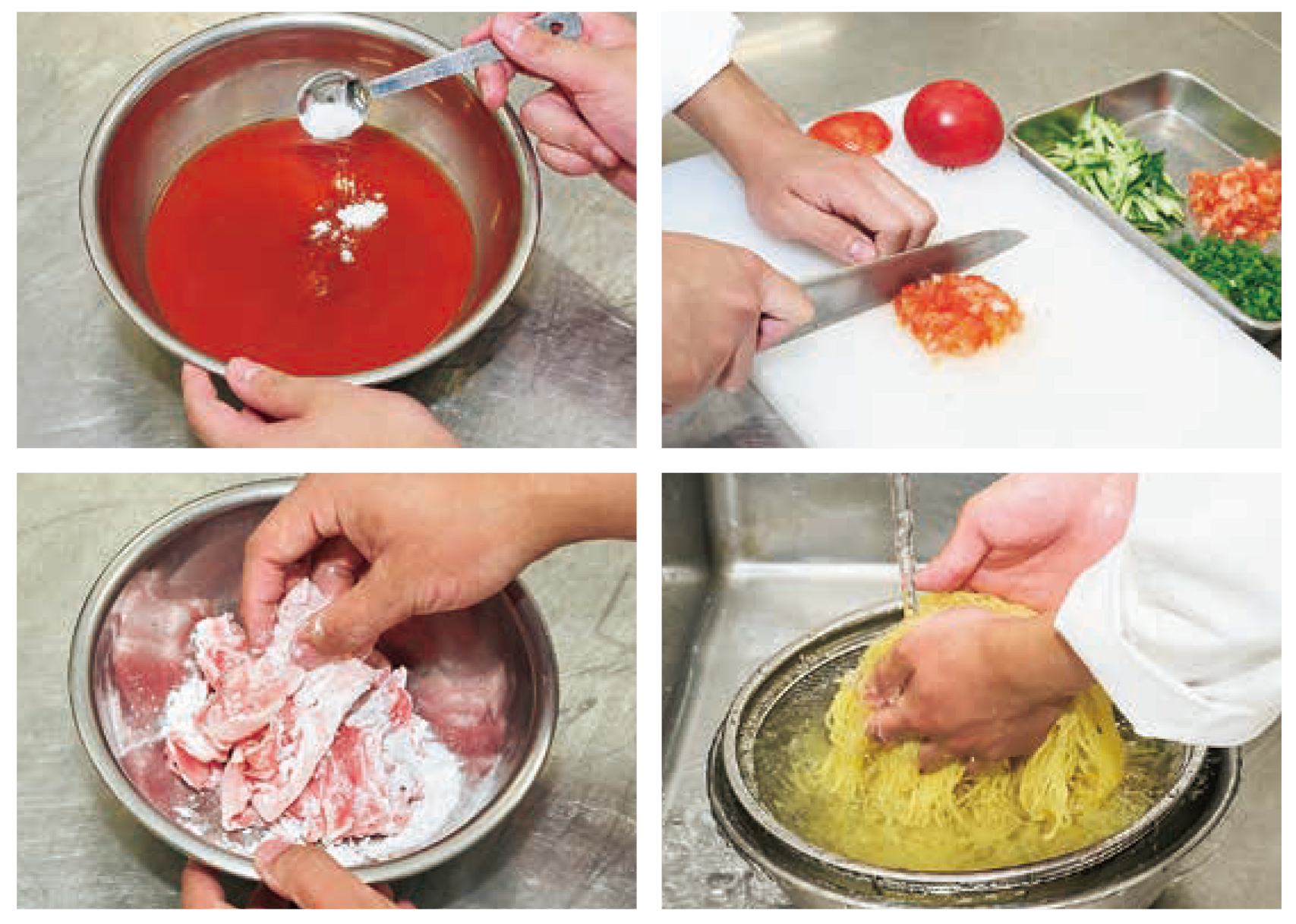- トマトは角切り、胡瓜は太めの千切り、小ねぎは小口に切っておく。